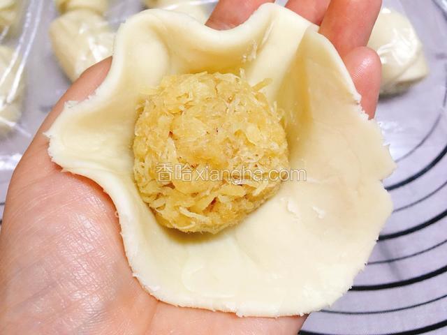 2.将所有材料放在盆内,用厨师机和面档和成面团。手和面步骤是,热水将猪油化开,用筷子和成棉絮状,再用手搓揉成团。