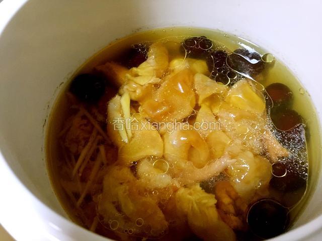 6.炖盅内依次放入鸡肉、花胶、红枣、姜丝