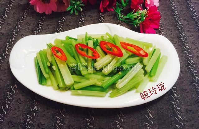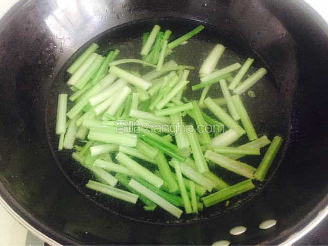 6.看着芹菜变色后捞出放冷水浸泡,水里滴入几滴白醋,浸泡后不但颜色好看做出来吃着口感又脆