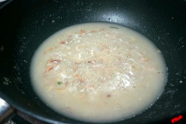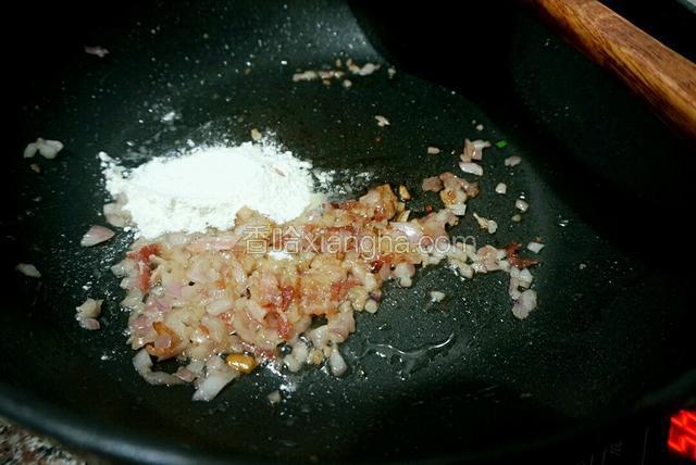 5.调至小火 把面粉倒入炒至稍黄
