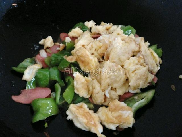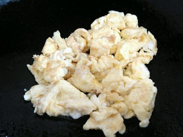 6.鸡蛋炒至凝固,用铲子切成小块,盛出来备用。