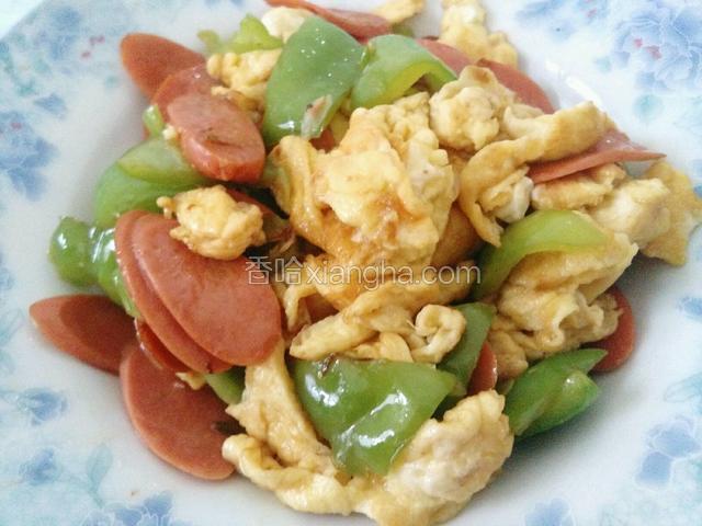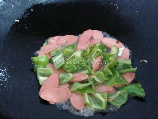2.尖椒切成块,火腿肠斜刀切成片。