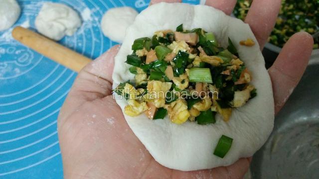 5.韭菜,鸡蛋,火腿肠全部切碎,放在一个容器