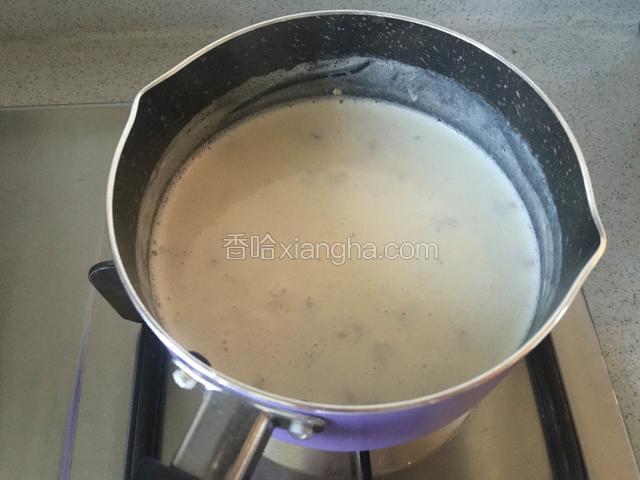 4.把燕麦片倒入牛奶里一起煮至微开,小火再煮一会即可。