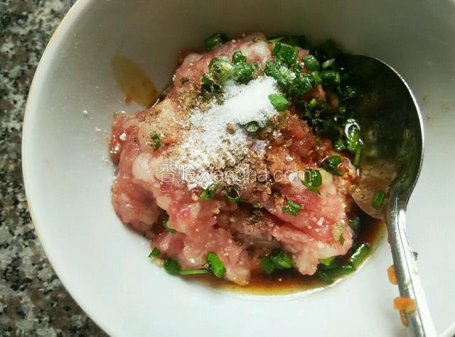 3.将肉和葱放入碗中,放入盐,胡椒粉,生粉,料酒和生抽搅拌均匀,腌制十分钟
