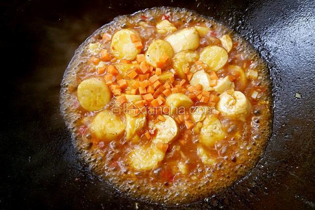 6.快起锅的时候放入胡萝卜粒,煮一会儿出锅。