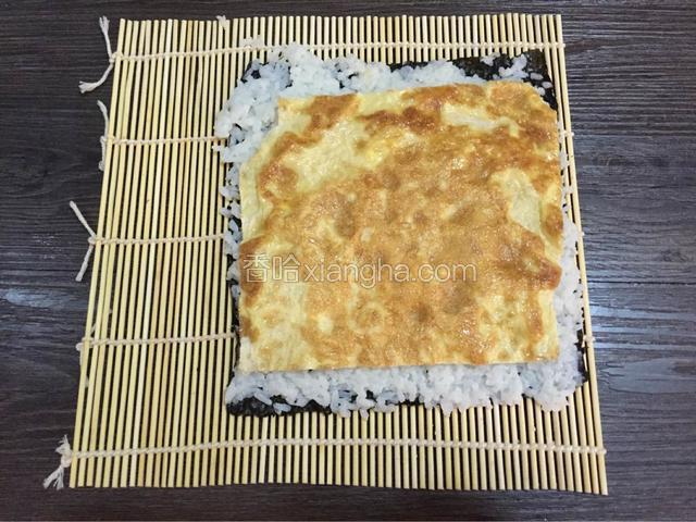 5.海苔铺在寿司卷帘上,光面朝下铺好米饭,用铲子压平,放入鸡蛋饼