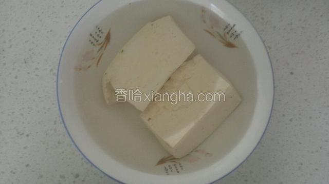 3.将浸泡好的豆腐切成2厘米左右的方块,厚度约1厘米。