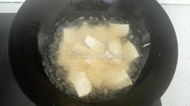 4.锅中倒油七成热时下入豆腐,中火炸制。