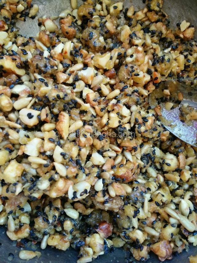 4.花生米,核桃仁,腰果切成很小的碎块。