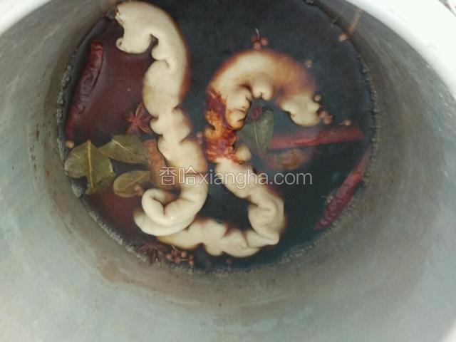 5.高压锅放适量清水,把大肠和所有材料放进去,干辣椒2个也放进去,这是微辣,不吃辣就不放,再倒入卤水汁约50克,老抽少许,盐少许(注意盐别放太多),盖上盖上汽后中小火再压20分钟(如果没高压锅砂锅煲最好,我是节约时间用的高压锅,砂锅或者电饭锅用时1小时);