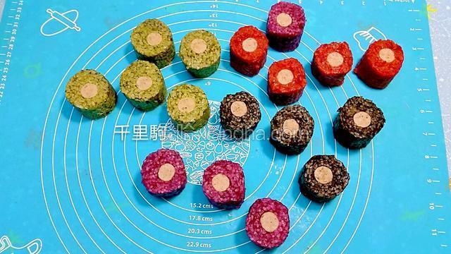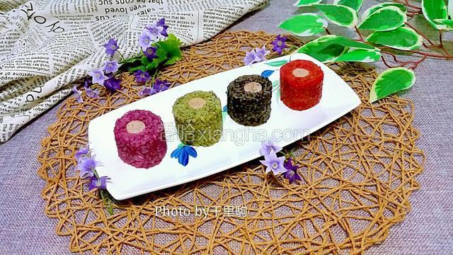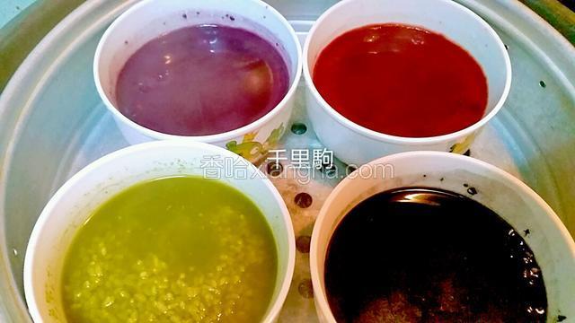 1.将珍珠米每碗100克盛入4个碗里,珍珠米清洗后每碗分別加入红菜头粉、紫薯粉、抹茶粉、竹碳粉