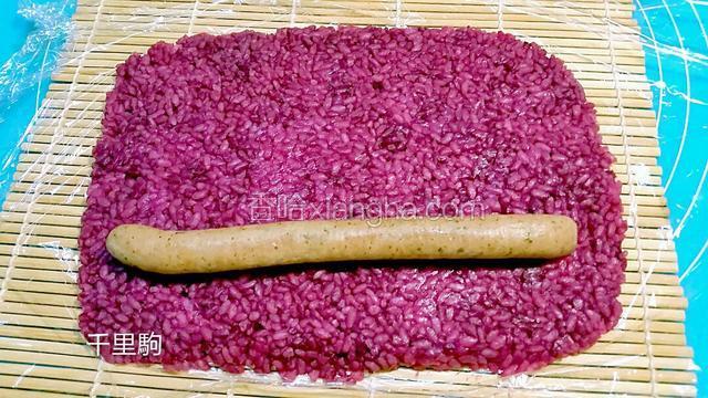 5.寿司席铺上一张保鲜膜,勺入竹碳米饭铺平,放上烤肠