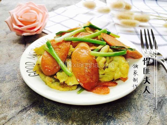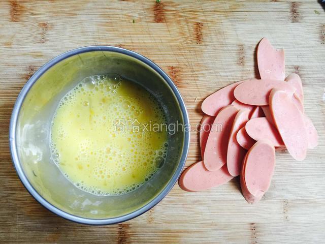 1.鸡蛋打入碗中搅打均匀,火腿肠斜切成片。