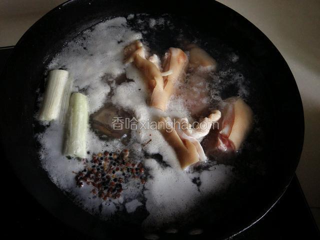 2.放在凉水中加入葱段,姜片和花椒粒冒血水煮2分钟