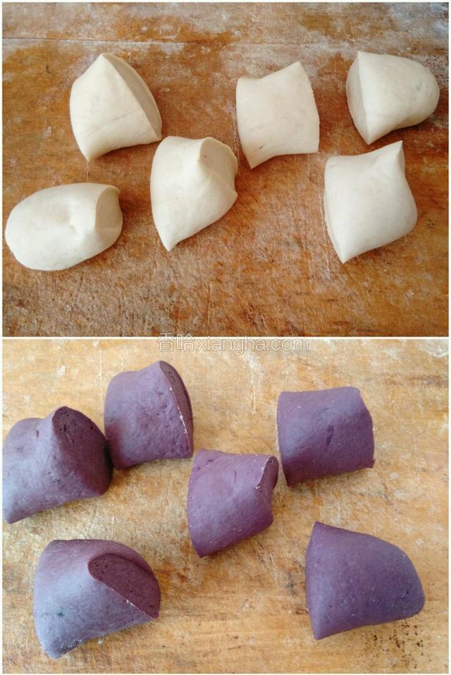 2.一半面粉加入紫薯粉搅拌均匀。