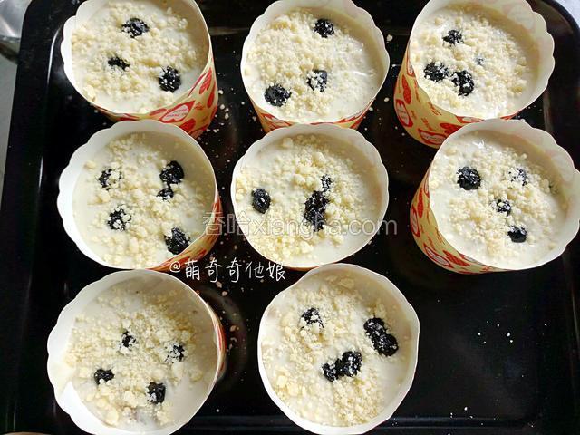 2.先来做香酥粒,黄油20g室温软化,加入低粉50g和白糖25g。 蓝莓干提前泡发,鲜蓝莓洗干净沥水即可。