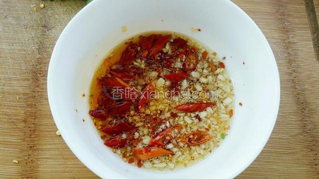 3.香菜和红辣椒切小段,大蒜切成蒜末。