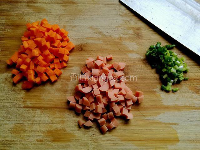 3.胡萝卜去皮切丁,火腿肠切丁,葱切成葱花。