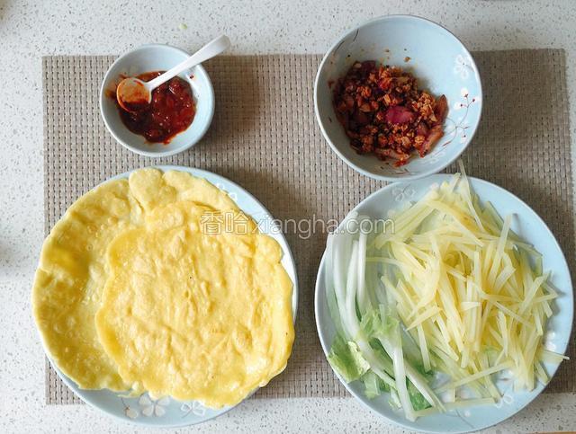 2.白菜切长条,土豆切丝,洋葱切小块; 鸡蛋打入面粉中搅拌均匀,加入适量盐; 猪肉末中加入:大葱切末、豆瓣酱、料酒、盐、草果粉。