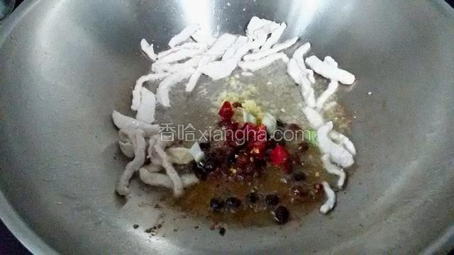 5.油热后放肉丝煸香,然后放入葱姜干辣椒炒一下,再放入豆豉煸炒。