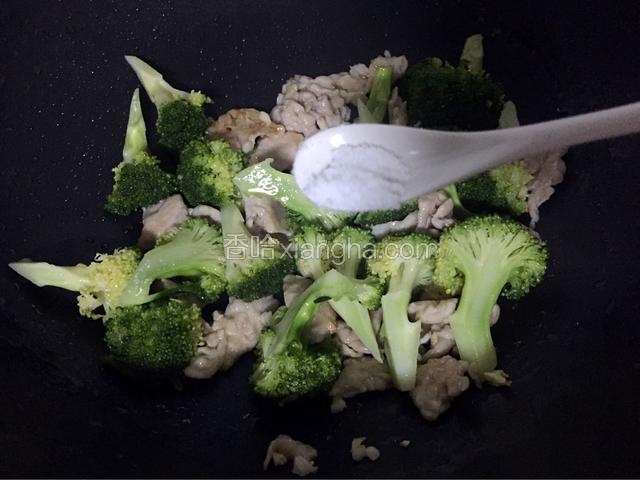 2.猪肉洗净切薄片后加入适量的盐和鸡精、生抽、淀粉、胚芽油抓匀腌制半小时,西兰花切成小朵洗净,蒜切末备用