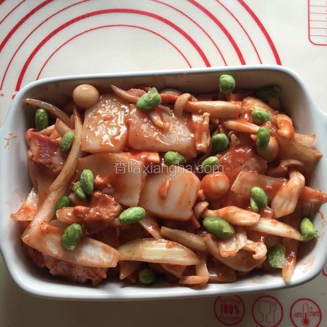6.把年糕片、洋葱、培根片、蟹味菇放入一个大碗中,放入一点点盐、黑胡椒粉、披萨草粉、挤入番茄酱