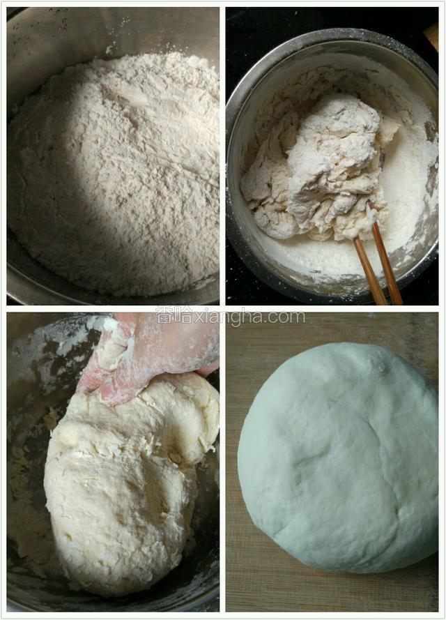 3.用筷子把面粉搅成棉絮状,用手揉搓,转到案板上揉光滑。