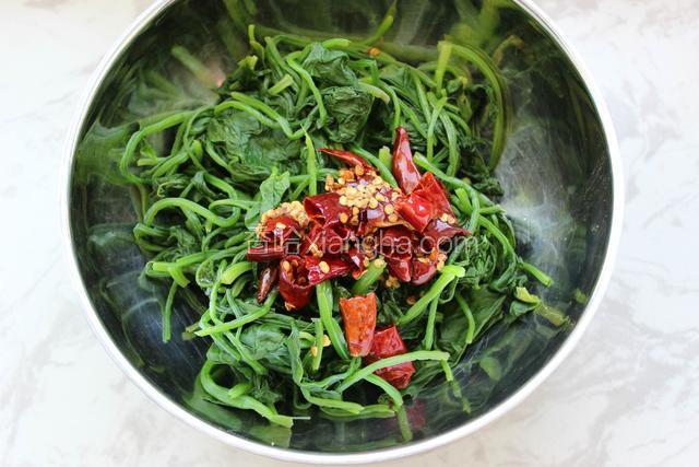 2.放入加入盐的沸水中焯烫1分钟,挤干水分备用