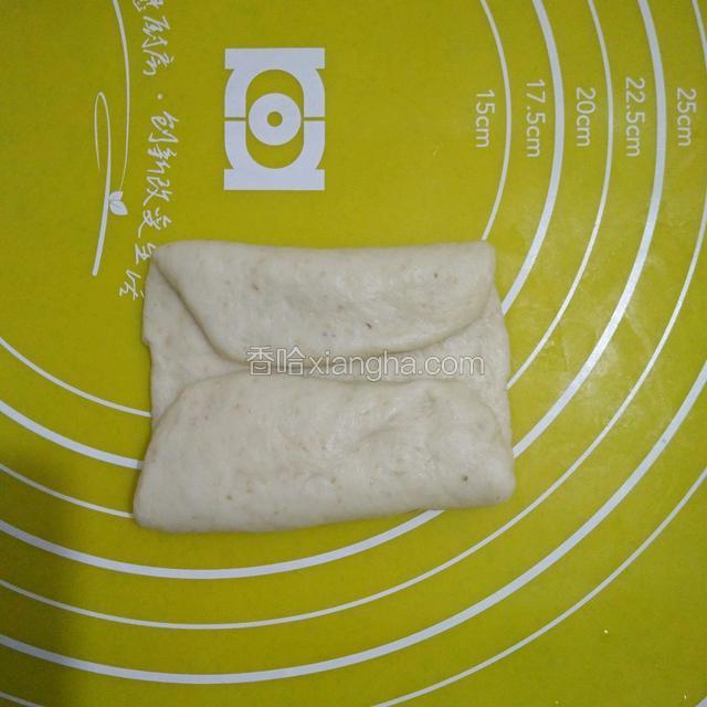 5.从面包机中把面团拿出来排气,多揉几下,把面团用擀面杖擀成长舌头状,像图中这样卷