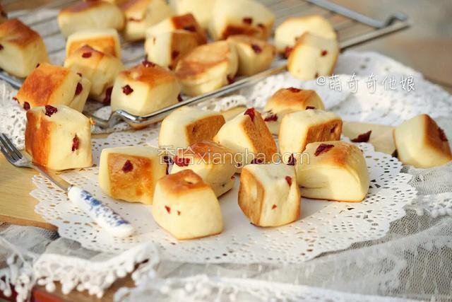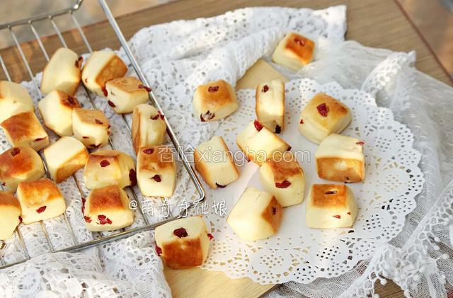 16.用刀切成条再切成块后,均匀地码在不粘烤盘上。如果烤盘要粘,则需铺油纸。