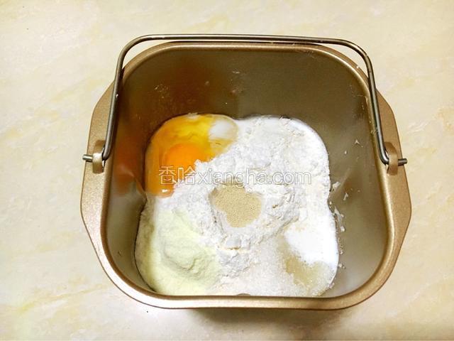 3.将发好的波兰酵头和所有主面团材料(除黄油外)放入面包机里盐和糖对角放,中间放酵母。起动一个揉面程序。大约30分钟。(如果全程手工揉面,请看我的“全麦面包”菜谱,里面有详细的手工揉面过程)