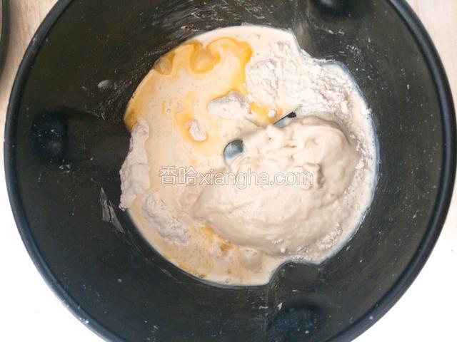 3.除黄油外加入发酵好的 酵头一起放入和面机,