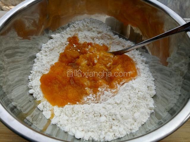 3.蒸熟的南瓜,用勺子压烂,放凉备用