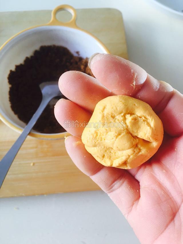 4.用手将糯米粉和南瓜泥揉匀揉透成一个面团,再用潮毛巾盖在容器上醒30分钟。