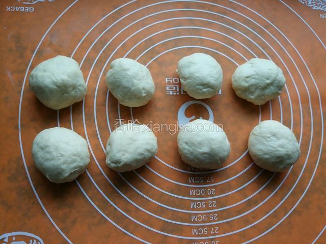 5.揉均排气拿出分成八个相同小面团,揉均匀盖保鲜膜松弛十五分钟!