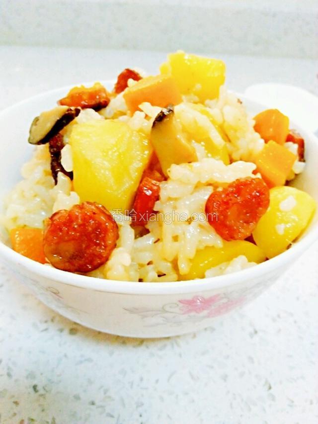 2.土豆,胡萝卜去皮切小丁,香肠香菇切小丁;香菇要提前泡发,湿香菇就不用泡了;