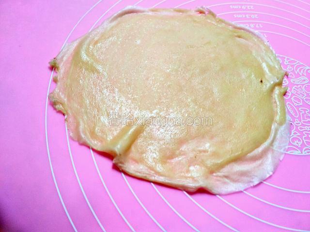 5.不粘锅放火上烧热后把火调成小火。舀一勺面煳倒入锅中,然后旋转锅使面糊均匀的摊成一张薄饼。然后将不粘锅放在湿抹布上冷却轻轻的揭开千层皮后再放火上小火加热,继续舀一勺面糊摊皮,不圆没关系可以切的。