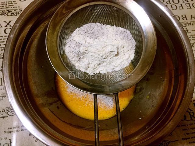 4.低筋面粉和咖啡粉混合筛入,分两次筛入,每次拌匀再筛入下一次