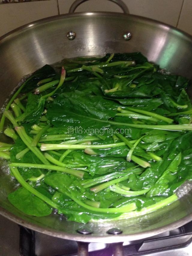 3.锅内烧水,水开后滴几滴油后下菠菜烫熟。
