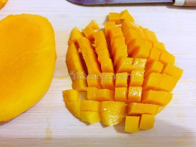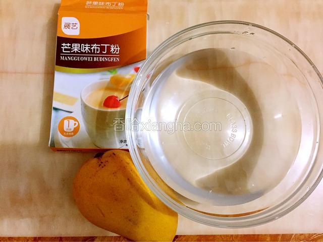 3.水沸腾后转小火,加入芒果味布丁粉,用手动打蛋器搅拌至充分融合、均匀。