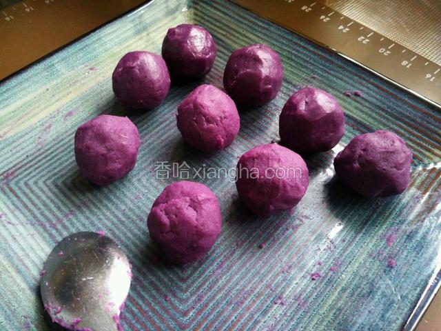 2.手上抹上少许食用油,将紫薯泥搓成小球。