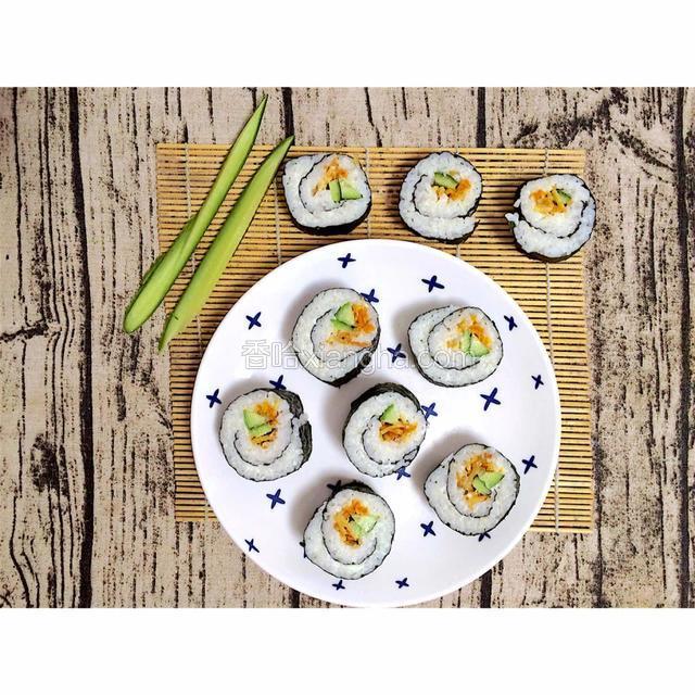 1.准备好所需材料并称好备用,准备制作工具:七孔寿司刀一把;寿司帘一张;电饭煲!