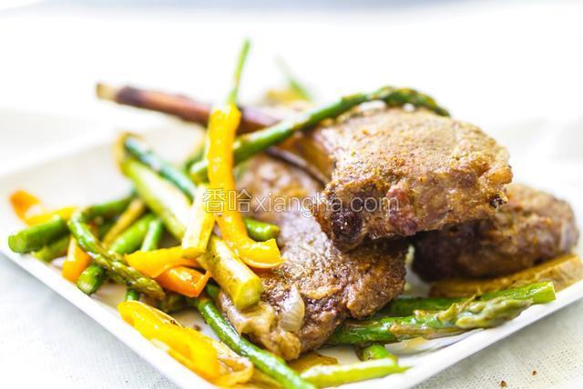 6.10分钟后,将羊排两面刷油,加入芦笋菜椒,继续烤20分钟,即可。