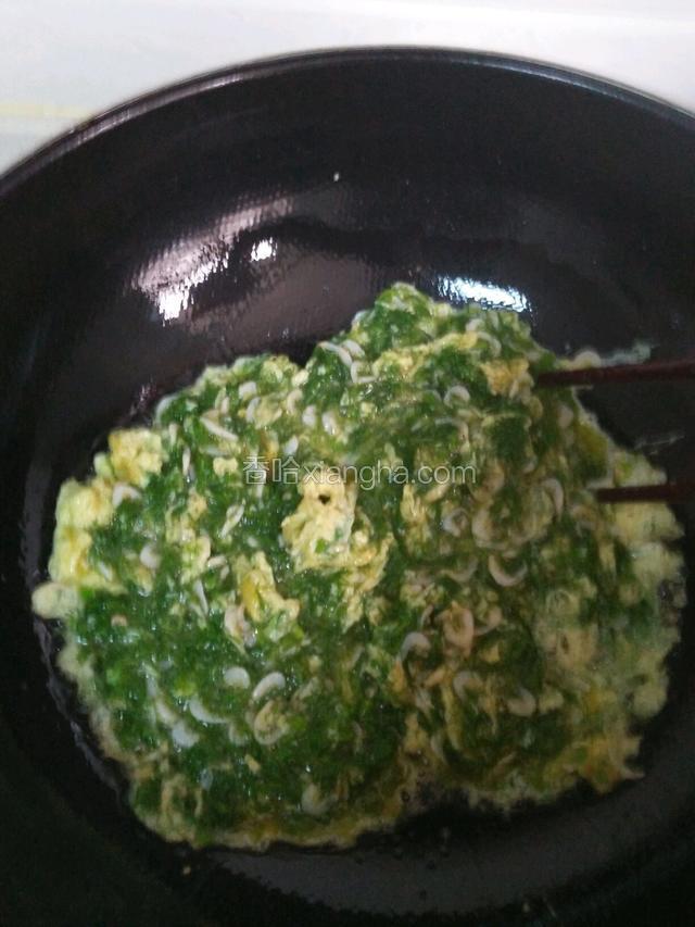 4.茴香洗净切碎,和鸡蛋虾皮拌匀,再加入适量的盐