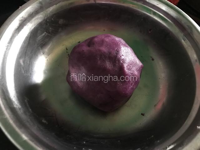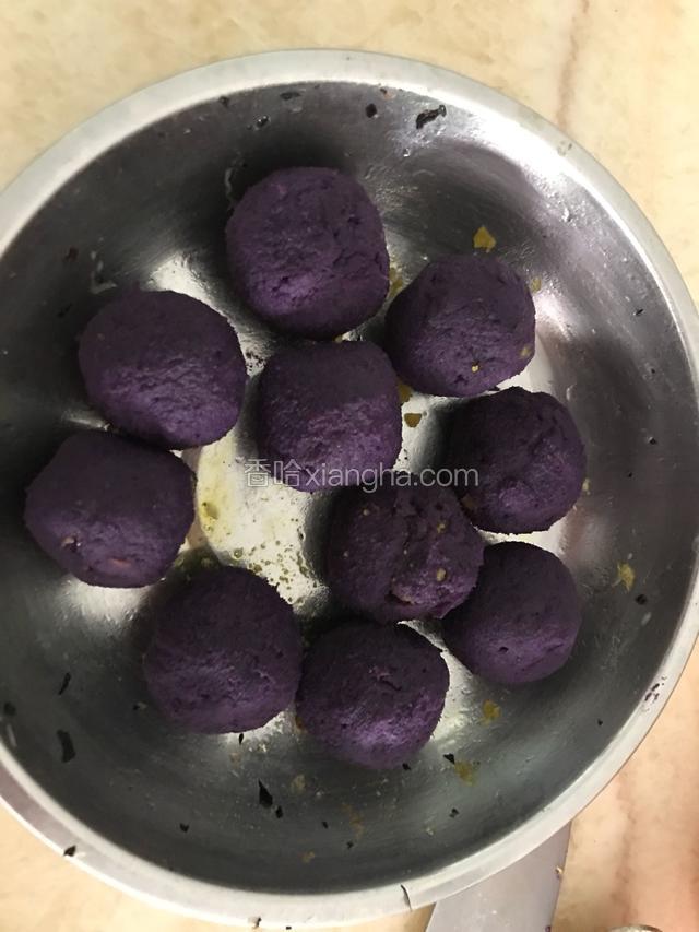 6.把步骤4的紫薯泥分称成20g一个,再把半个咸蛋黄包进去,搓圆做成一个个紫薯蛋黄馅。