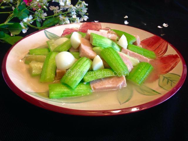 3.独蒜切成1/4,午餐肉丝瓜切成大小差不多的条。