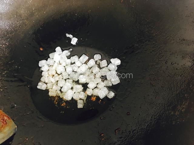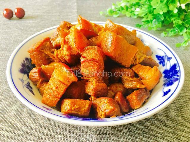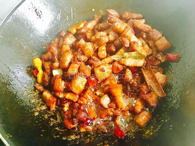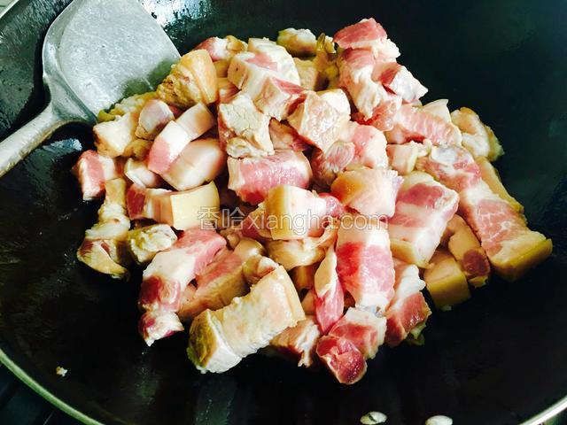 5.浸泡过的五花肉捞起沥干水分,把它切成2厘米左右的方块。