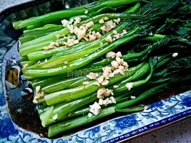 6.待菜心中心成为透明的,就熟了。捞出淋干水,摆盘。