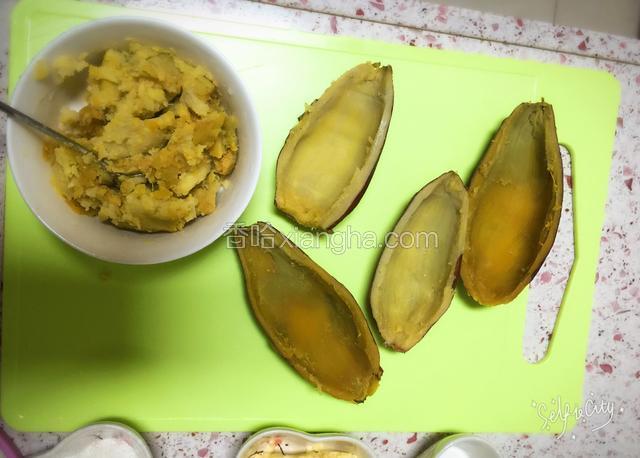 5.把搅拌好的红薯泥再酿回刚刚挖空的红薯壳里。